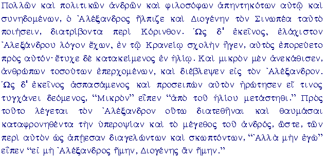 Questo celebre episodio mette bene in luce l'intelligenza e la personalità anticonvenzionale del grande macedone: egli infatti, anziché sdegnarsi o irritarsi di fronte all'irriverente noncuranza del filosofo cinico Diogene, prova sincera ammirazione per lui.