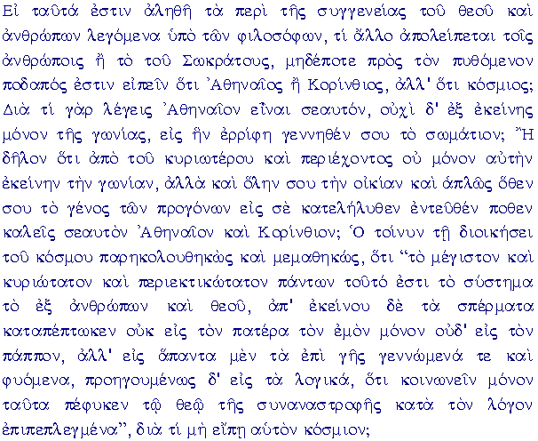 Epitteto, Dissertationes ab Arriano digestae 1. 9. 1-6 Se sono vere queste affermazioni dei1 filosofi circa la parentela tra2 Dio e gli uomini, che altro rimane agli uomini se non l’(esempio) di Socrate, (cioè) di non dire mai, a chi (gli) domandasse di dove fosse, che era ateniese o corinzio, ma cittadino del mondo? Perché infatti dici di essere ateniese e non invece di quell’angolo soltanto in cui fu gettato il tuo misero corpo quando nacque? O evidentemente, (provenendo) dal (luogo) più importante, e che comprende non solo quello stesso angolo, ma anche tutta la tua famiglia, e insomma (il paese) da cui è discesa fino a te la stirpe dei (tuoi) avi, da quello, per caso, prendi il nome di Ateniese e Corinzio3? (a) oppure: o (non) è evidente che dal (luogo) più importante, e che comprende non solo quello stesso angolo, ma anche tutta la tua famiglia, e insomma (il paese) da cui è discesa fino a te la stirpe dei (tuoi) avi, da quello, qualunque esso sia, prendi il nome di Ateniese e Corinzio3? (b) o non (è) chiaro che (derivi) da un essere superiore, e che comprende non solo quello stesso angolo (di terra), ma anche l’intera tua casata, e che tu francamente ti chiami ateniese e corinzio se mai dal luogo da cui la stirpe dei tuoi progenitori è giunta fino a te? (c) Colui dunque che abbia studiato attentamente l’organizzazione dell’universo e che abbia imparato che "la più grande e la più autorevole e la più universale di tutte (le comunità) è quella tra4 uomini e Dio, e che da quello (= Dio) sono discesi i semi generativi, non solo in mio padre e nemmeno in mio nonno, ma in tutte le cose che sono generate e che crescono sulla terra, e principalmente negli esseri razionali, poiché solo questi partecipano per natura5 della relazione con Dio, essendo legati a lui attraverso6 la ragione", perché non dovrebbe dire che è cittadino del mondo?