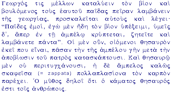 Un contadino in punto di morte, volendo inculcare nei suoi figli l'amore per il lavoro, ricorre ad uno stratagemma.