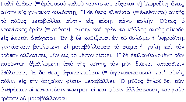 Una simpatica variazione sul noto tema "il lupo perde il pelo ma non il vizio". Una gatta, innamorata di un ragazzo, ottiene da Afrodite di essere trasformata in una bella fanciulla. Purtroppo per lei, però, la sua indole felina verrà ben presto a galla!