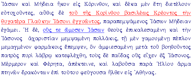 Giàsone e Medea giunsero1 a Corinto e (vi) trascorsero1 dieci anni felicemente, ma un giorno2, poiché Creonte, il re di Corinto, offriva in moglie a Giàsone la figlia Glauce, Giàsone, ripudiata Medea, sposò1 (la principessa). Allora ella (= Medea), chiamati a testimoni gli dèi su cui Giàsone aveva giurato e biasimata più volte l'ingratitudine di Giàsone, mandò (in dono) alla sposa un peplo intriso di veleni, indossato il quale (ella) fu divorata da un fuoco violento insieme con il padre che cercava di soccorrerla, poi uccise i figli che aveva (avuto) da Giàsone, Mèrmero e Ferète, e, ottenuto dal Sole un carro trainato da3 draghi alati, fuggendo su questo giunse ad Atene. |