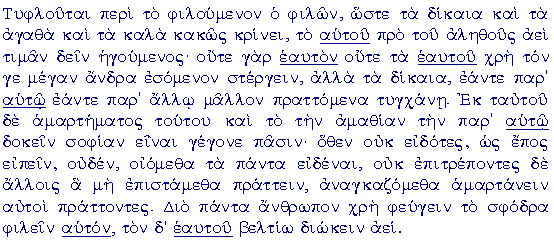 Chi ama è cieco riguardo all’(oggetto) amato, cosicché giudica male il giusto, il bene e l’onesto1, ritenendo di dover anteporre sempre il proprio (interesse) al vero2; bisogna infatti che l’uomo destinato ad essere grande non ami né se stesso né le proprie cose, ma il giusto, sia che si trovi ad essere messo in pratica da lui, sia piuttosto da un altro. Ed (è) da questo stesso errore (che) è nata per tutti la convinzione che la propria ignoranza sia sapienza3; per cui, (pur) non sapendo, per così dire, nulla, pensiamo di sapere tutto, e, non affidando ad altri ciò che4 non sappiamo fare, siamo costretti a sbagliare facendo(lo) da soli5. Perciò bisogna che ogni uomo eviti di amare troppo se stesso, ma cerchi di seguire sempre chi è6 migliore di lui.
