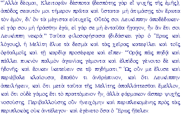 Nel romanzo greco d’amore, in cui la fedeltà reciproca è d’obbligo, esiste un'eccezione: Clitofonte, il protagonista-narratore del romanzo di Achille Tazio, il quale, quando sta per lasciare Mèlite, che lo ha salvato e che lo ama pazzamente, si concede a lei per la prima ed ultima volta. Il brano riportato si apre con le suppliche della donna.
