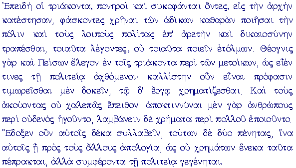 La testimonianza di Lisia nella Contro Eratostene è un documento storico di eccezionale importanza: egli è infatti l’unico superstite della strage dei dieci (secondo altre fonti trenta) meteci1 ideata dai Trenta Tiranni (404 a.C.) come una sorta di cinico autofinanziamento.
