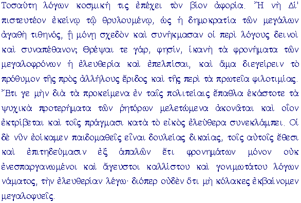 Lo Pseudo-Longino riporta qui l'opinione (che peraltro non condivide) di un suo anonimo interlocutore, convinto, come Tacito, che la decadenza dell'eloquenza sia dovuta soprattutto alla fine della libertà politica repubblicana.