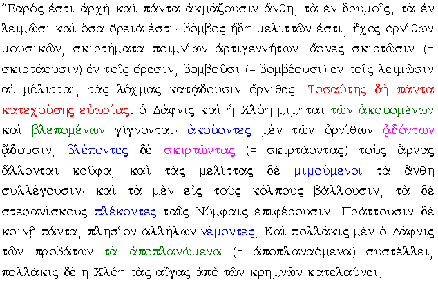 E' l'inizio della primavera e tutti i fiori sono in (pieno) rigoglio, quelli nei boschi, quelli nei prati e quanti crescono sui monti1; c'è già il ronzio delle api, il canto degli uccelli melodiosi, i salti delle pecore nate da poco; gli agnelli saltellano sui monti, ronzano nei prati le api, gli uccelli riempiono del loro cinguettio i cespugli. Mentre una così bella stagione pervade tutto, Dafni e Cloe s'improvvisano2 imitatori di ciò che ascoltano e di ciò che vedono: ascoltando gli uccelli cantare cantano, e vedendo saltellare gli agnelli saltellano agilmente, e imitando le api raccolgono i fiori; ed alcuni (se li) gettano in grembo3, altri, intrecciando coroncine, (li) offrono alle Ninfe. Fanno tutto insieme, pascolando l'uno accanto all'altra. E spesso Dafni raduna quelle fra le pecore (di Cloe) che si sbrancano, spesso invece Cloe allontana le capre (di Dafni) dai precipizi. |