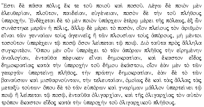 Dal suo punto di vista conservatore, Aristotele ritiene che l'oligarchia e la democrazia si differenzino in primo luogo per il fatto di privilegiare rispettivamente la qualità e la quantità.