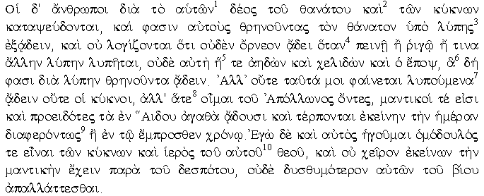 Come il cigno prima di morire canta il suo canto più bello perché sta per ricongiungersi al dio, così Socrate "canta" la sua certezza di ritornare alla luce vera, dopo la liberazione dell’anima dalle catene del corpo.
